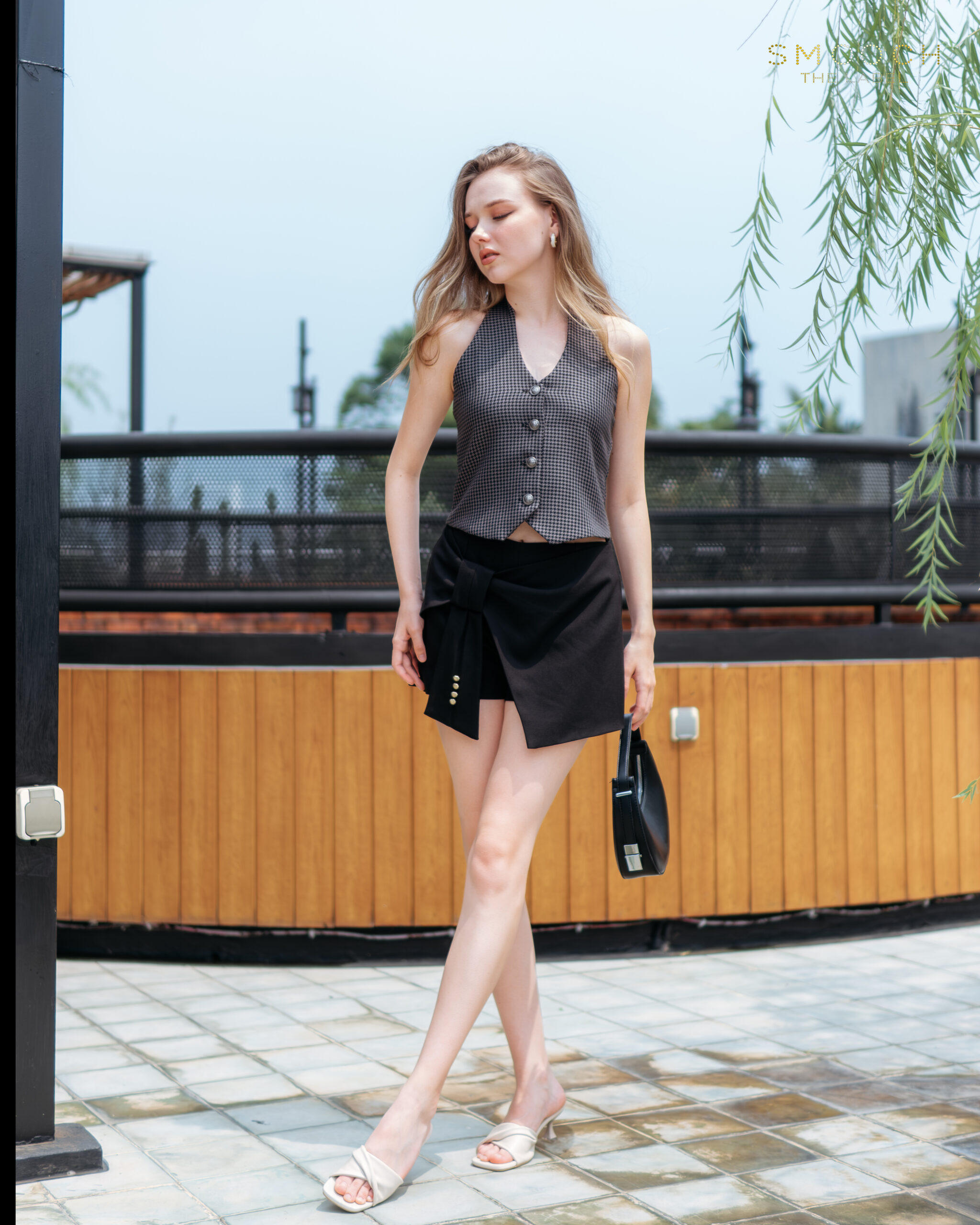 Celana pendek pinggang sedang berwarna hitam berbahan semi-wol, didesain dengan potongan yang rapi dan panel depan berlipat asimetris yang dilengkapi aksen kancing emas untuk detail yang elegan namun modern.