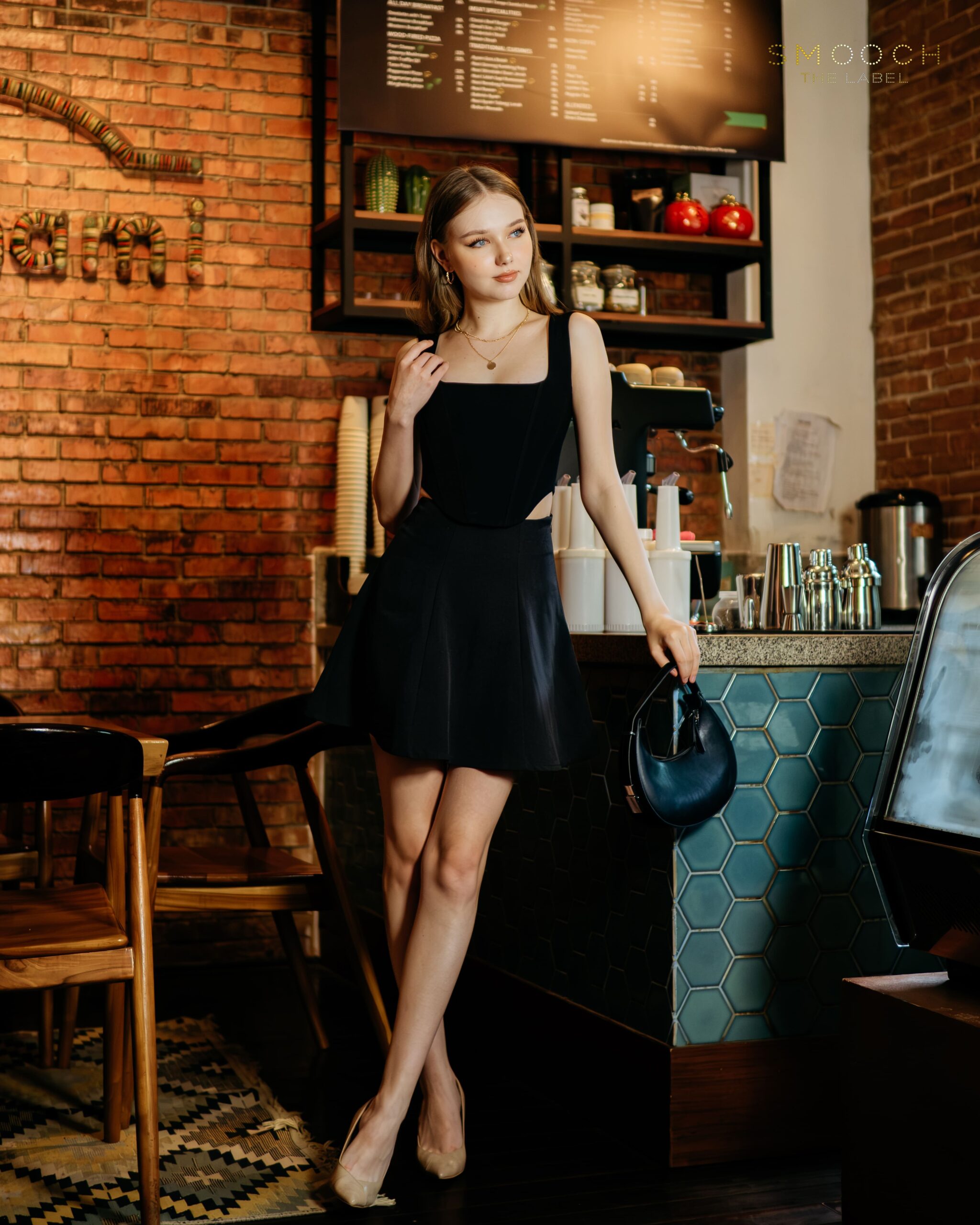Atasan ini terbuat dari wol semi premium, memberikan hasil akhir yang terstruktur namun tetap elegan. Siluetnya berupa atasan crop bergaya korset yang pas di badan dengan tali bahu lebar, leher persegi, dan ujung bawah yang runcing untuk menonjolkan pinggang. Detail minimalis membuat tampilan tetap ramping dan serbaguna.